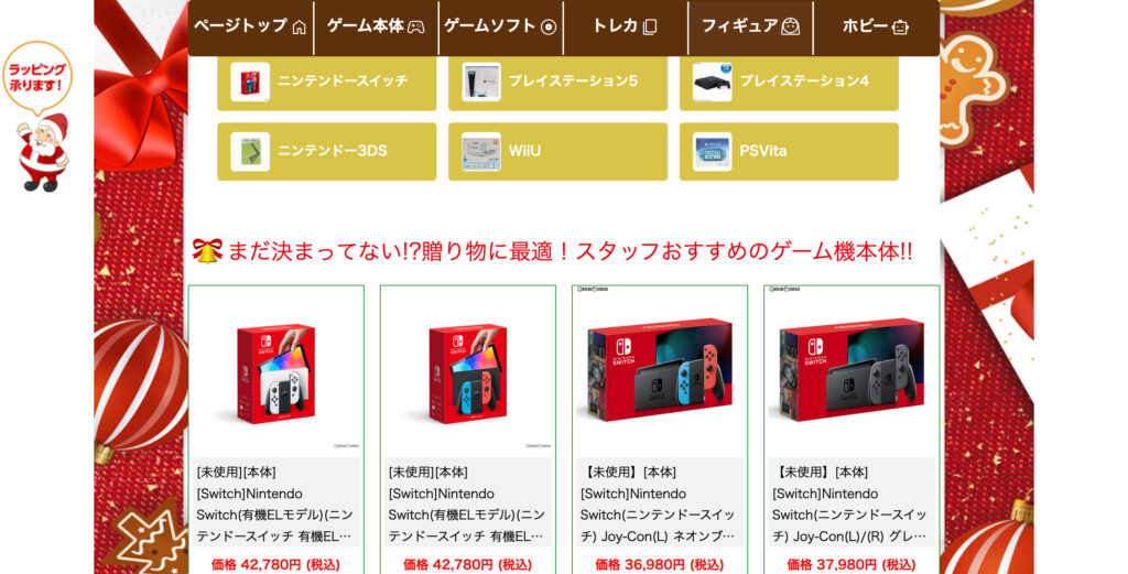 バナーは背景色にブルーを使い冬の寒いイメージを演出し、クリスマスらしいリボンやベルの装飾と目玉商品の画像を使用することで、主にクリスマスプレゼントを探しているユーザーが目を惹くようなデザインに仕上げました。